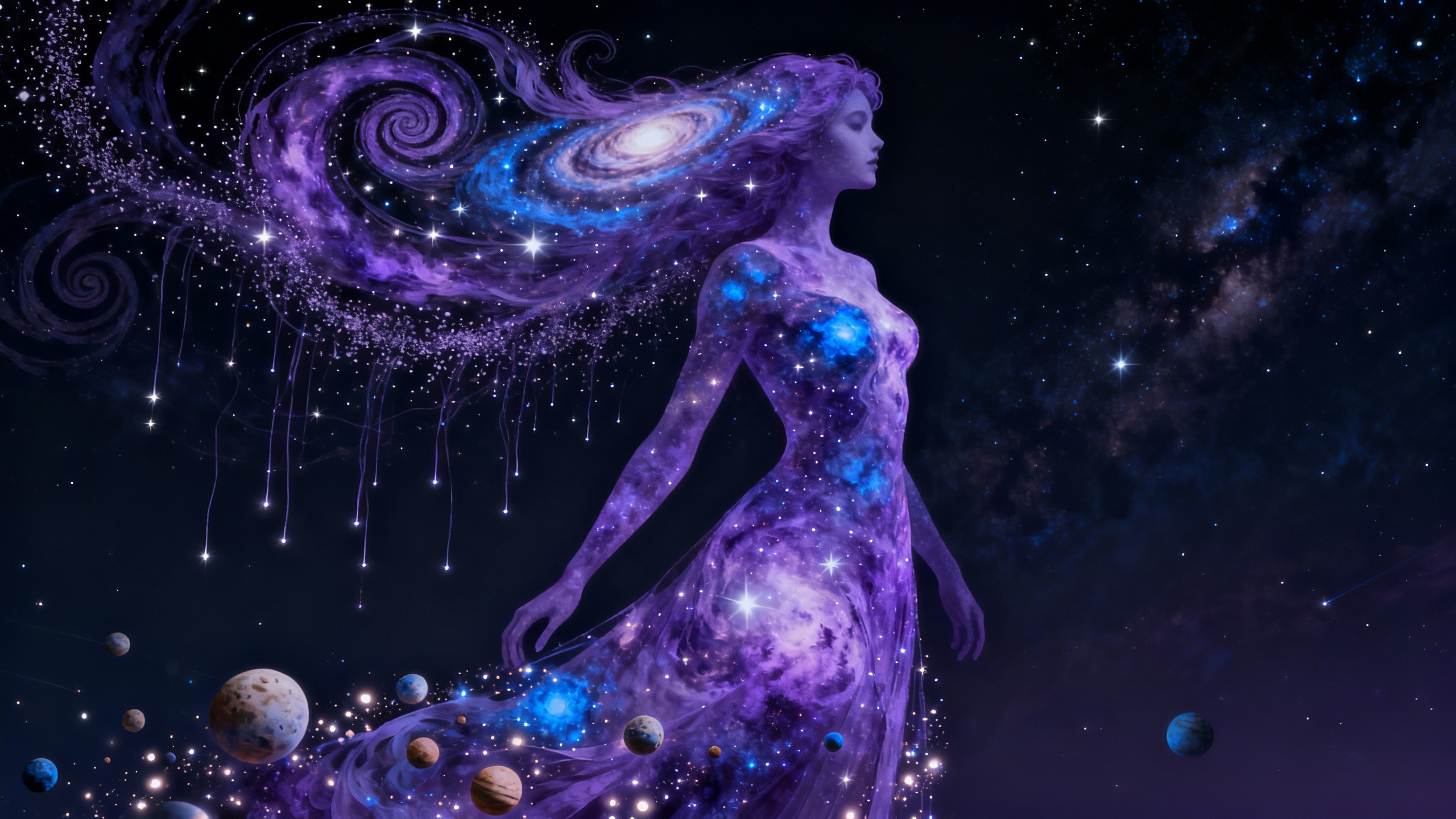 Paint a portrait made entirely of stars and galaxies swirling within human form.