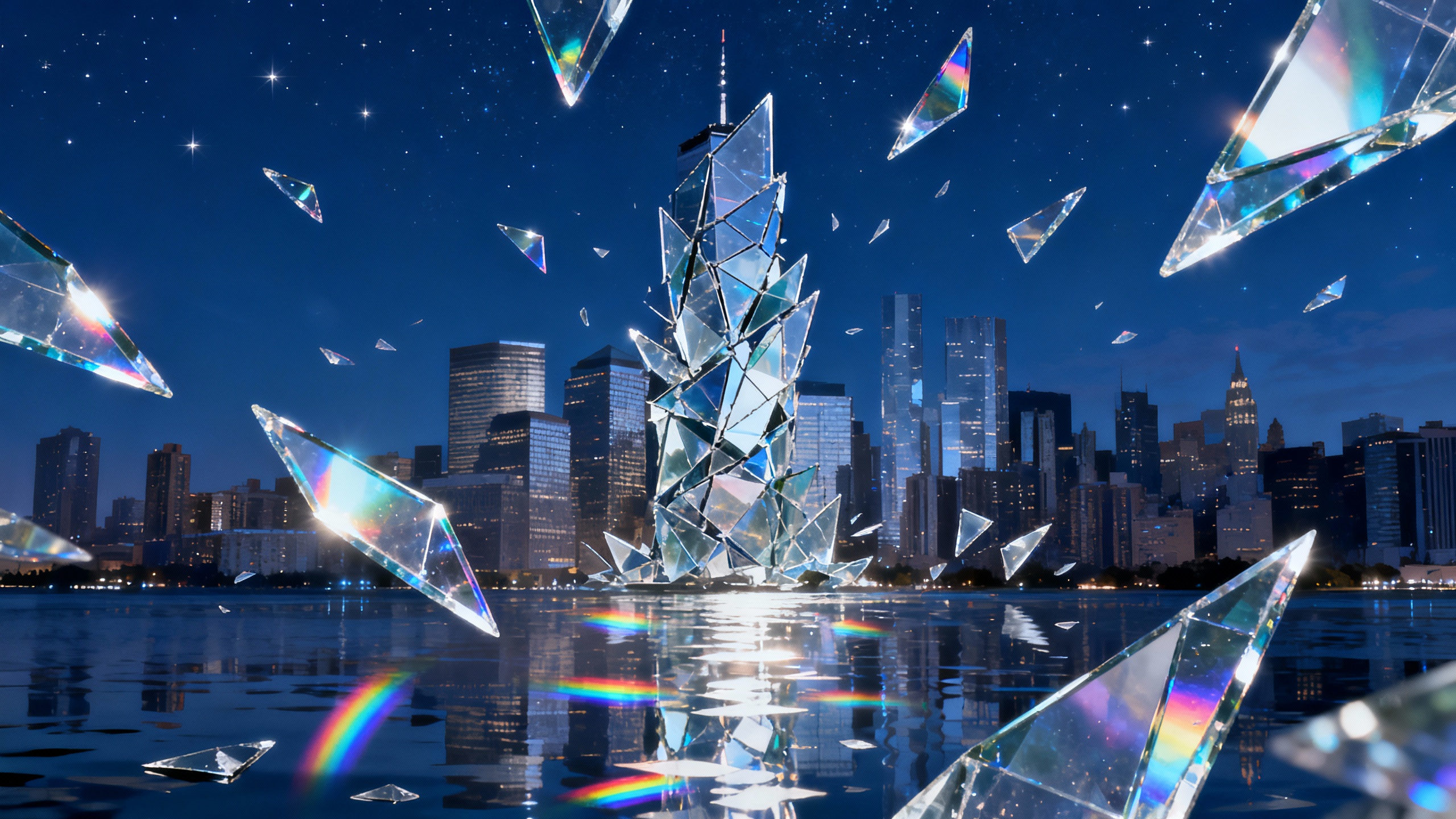Visualize a city skyline fragmented into floating shards of glass and light.