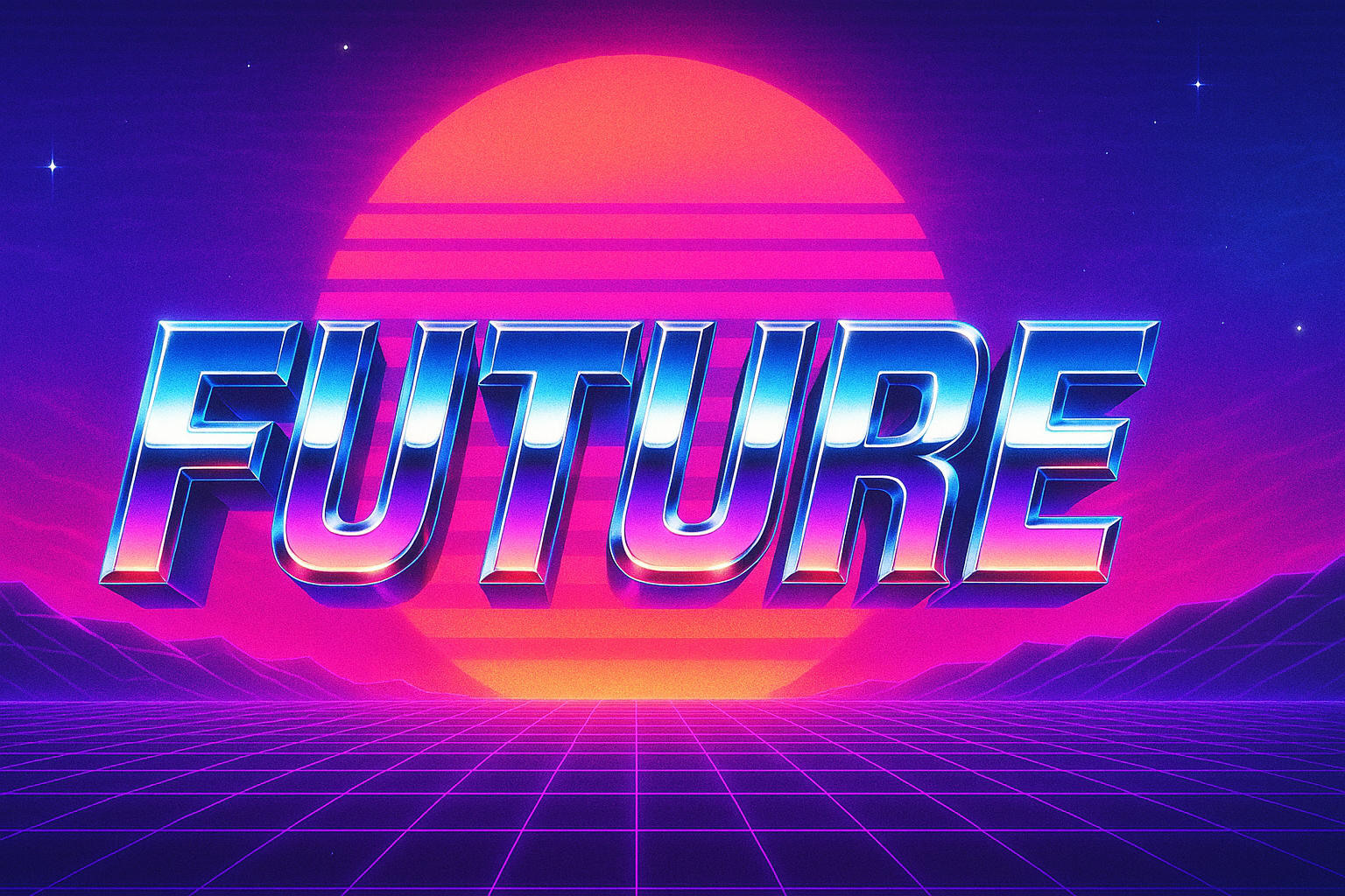 Design an 80s-inspired futuristic poster with chrome typography and vaporwave colors.