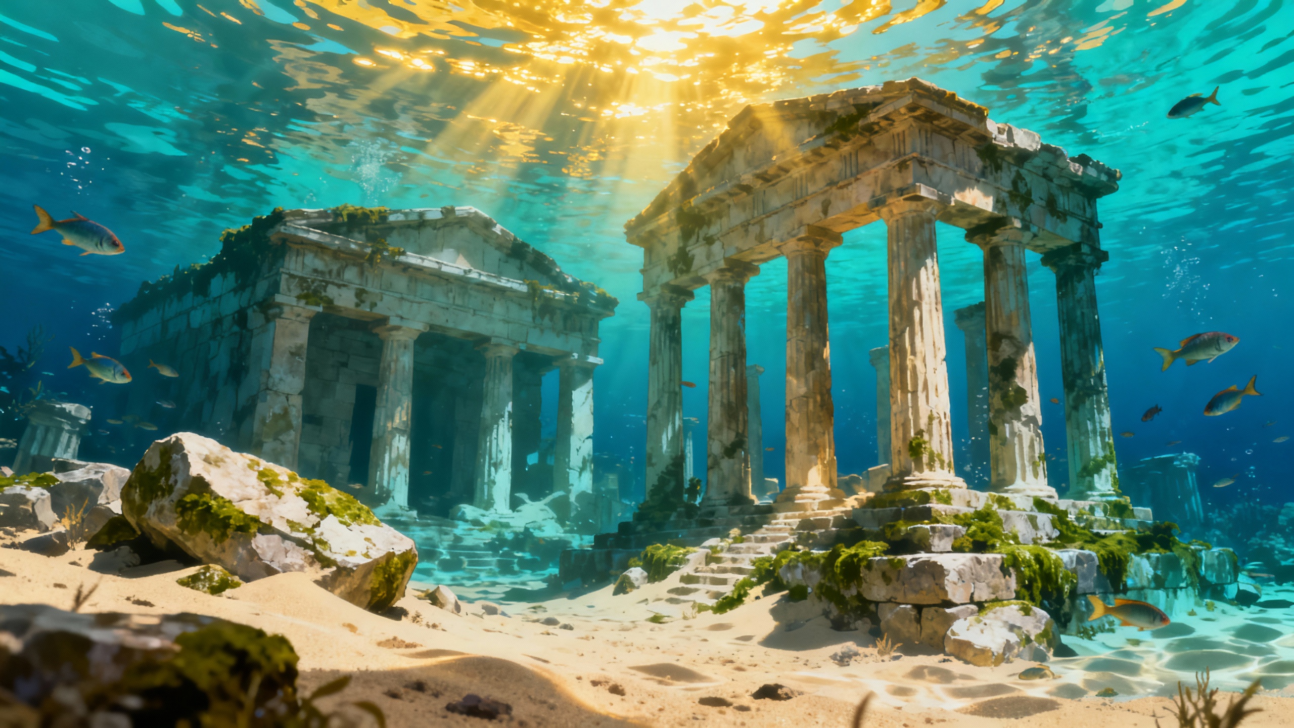 Illustrate ancient Greek temples submerged under crystal-clear water.